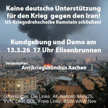 In Aachen gab es innerhalb einer Woche eine weitere Kundgebung, die sich mit dem Iran solidarisierte und eindeutig die imperialen Ansprüche von Israel und USA gegenüber dem Iran verurteilte.
