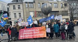 Von Andrej Hunko gab es den Bericht, wie die Rechtsstaatlichkeit in der gesamten EU weiter ausgehebelt wird. Er beschreib das ausführlich am Fall der Sanktionierung von Jacques Baud. Anschließend wurde mit einem Teil der Kundgebungsteilnehmer ein Foto gemacht, das diesen Protest ausdrückt.- Kritisiert wurde das Plädoyer vom Chef der konservativen EVP-Fraktion im Europaparlament, Manfred Weber, dass deutsche Soldaten unter europäischer Flagge an der Absicherung einer Friedenslösung in der Ukraine beteiligt werden sollten.