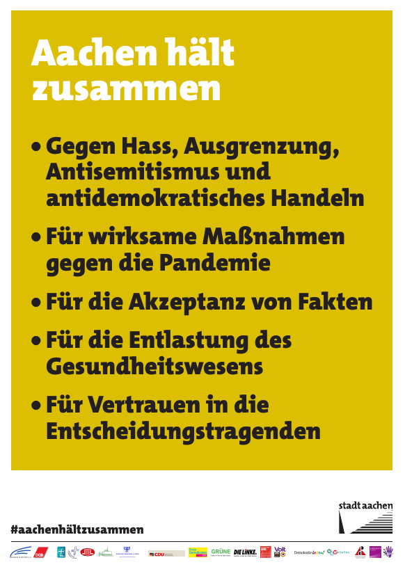 Mit großer Sorge betrachten wir in diesem Zusammenhang sogenannte Spaziergänge und Demonstrationen, auf denen diese Solidarität immer wieder in Frage gestellt wird. Das Recht auf freie Meinungsäußerung ist uns wichtig. Uns ist bewusst, dass nicht alle Teilnehmenden sogenannte Querdenker*innen sind. Doch versammeln sich dort auch regelmäßig Menschen, welche die Maßnahmen der Pandemiebekämpfung nicht mit sachlichen Argumenten kritisieren, sondern Verschwörungserzählungen und Geschichtsklitterung verbreiten. Unerträglich ist die Verharmlosung des Holocaust durch jene, die sich als vermeintliche Opfer der Corona-Politik inszenieren und dies mit #aachenhältzusammen einem gelben Stern oder anderen Verweisen auf das NSRegime zur Schau stellen. Völlig irrational und ohne jede sachliche Grundlage sind auch die vielfach auf diesen Demonstrationen formulierten Vorwürfe einer „Impfdiktatur“, eines „PharmaFaschismus“, einer „CoronaDiktatur“, der „Eugenik“ oder ähnlich absurde Begriffe. Die Verschwörungserzählungen über angeblich geheime Machenschaften der „Eliten“ werden auch aus dem Kreis der Aachener Impfgegner*innen propagiert und dürfen nicht unwidersprochen bleiben.