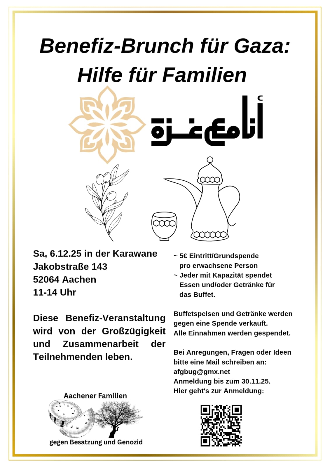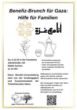 Benefizveranstaltung für Gaza 6. Dezember 2025 - 11:00 bis 14:00Karawane, Jakobstr 143Solidaritäts Brunch mit Diskussionen …. ICAL