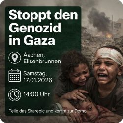 Stoppt den genozid in Gaza 17. Januar 2026 - 14:00 bis 16:00Elisenbrunnen, Friedrich-Wilhelm-Platz 1Kundgebung und Demo ICAL