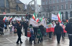 Am Sonntag gegen 16 Uhr zog wieder mal eine Schah-sympathisierende Gruppe von ca. 100 Leuten am Hbf vorbei. Sie trugen Iran- und Israel-Fahnen und skandierten Sprüche wie „Danke Bibi, danke Trump“.