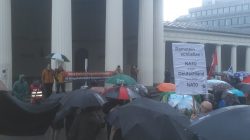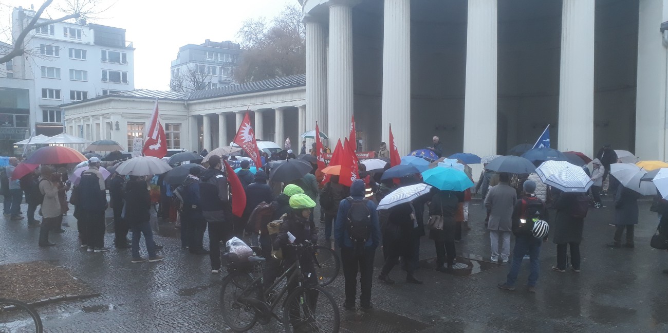 Trotz des eiskalten und stark verregneten Wetters waren knapp 150 Leute zur Kundgebung gekommen. (Hier zum Aufruf Flyer) Im späteren Verlauf der Veranstaltung gab es auf dem Platz eine Kontroverse (s.u.) und danach bröckelte die Anzahl auf ca. 80 Leute.