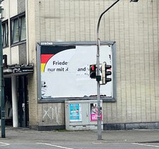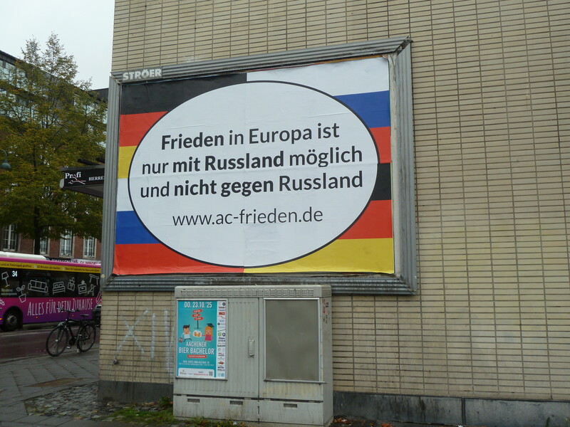 In Aachen findet aktuell eine Friedenskampagne der besonderen Art statt. Auf Werbeflächen, worauf die Bevölkerung normalerweise mit großen Plakaten zum Kauf unterschiedlicher Waren motiviert wird, hängen vom 7. bis zum 16. Oktober große Plakate, auf denen für Frieden mit Russland geworben wird. Schon von Weitem deutlich sichtbar können Fußgänger, Radfahrer und Autofahrer auf acht Werbeflächen lesen: „Frieden in Europa ist nur mit Russland möglich und nicht gegen Russland.“