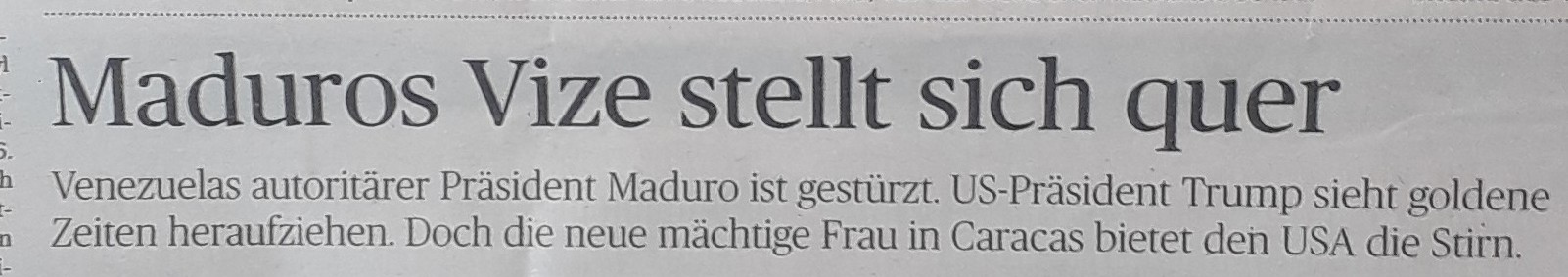 Das heißt, das Ereignis selber kommt schon gar nicht mehr vor, sondern nur noch die Konsequenzen, die sich für Venezuela aus diesem Staatsterrorismus im Nachgang ergeben, „weil die jetzt ja einen neuen Präsidenten brauchen“. Und außerdem ist aus venezuelanischer Sicht natürlich klar, dass die bisherige Vize-Präsidentin jetzt dieses Amt übernimmt.